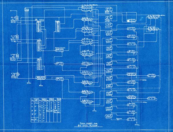 Once these engineers had been consulted, they would draw up a flow sheet, such as the one seen here. Flow sheets were ‘a graphic representation of the manufacturing system followed in a flour mill’ and would show the course different materials would take through the machinery (Voller, p.336). Once this had been drawn by said engineer and understood, attention could turn to the building itself.