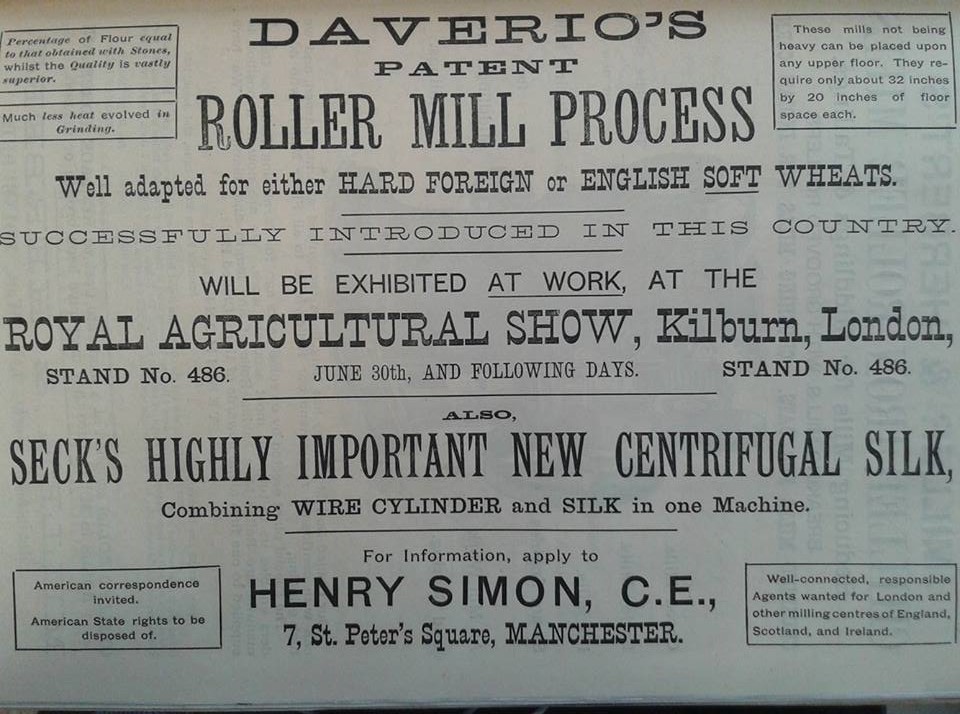 Before choosing to commit to a particular piece of machinery or engineering company, it is best to have seen the machinery in action first. A way of achieving this was to attend an exhibition, something many British millers did and it is arguably thanks to exhibitions that roller milling ever succeeded in Britain. The most common type of exhibition in Britain was those put on by the Royal Agricultural Society of England (RASE). They held shows annually with some examples being: Taunton in 1875, Birmingham in 1876, Liverpool in 1877, Bristol in 1878, Kilburn in 1879, and Carlisle in 1880. The exhibition in Kilburn is remembered as notable with 12 exhibitors of chilled iron rollers including Simon with Daverio’s design, Carter, Buchholz with Ganz designs and Throop as an agent for Gray.