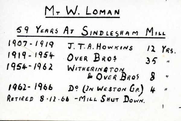 On the other hand, rather than being loyal to an individual or a company, a worker may have been loyal to a mill or his profession. This record of Mr. W. Loman shows him working at Sindlesham Mill for 59 years. During this time he started work for Mr. J. T. A. Howkins, until he sold the mill to the Over Brothers. Mr Loman continued to work for the Over Bros. for 35 years and another 8 years after they had merged to become Witherington & Over Bros. In 1962 the company was taken over by the Weston Group who Mr. Loman worked for until they closed the mill down in 1966 and he was forced to retire. Mr. W. Lowman could not be called anything but loyal but to Sindlesham Mill rather than any specific company or individual so housing, sports teams and help during difficult periods was not the motivation behind his actions, his love of milling was.