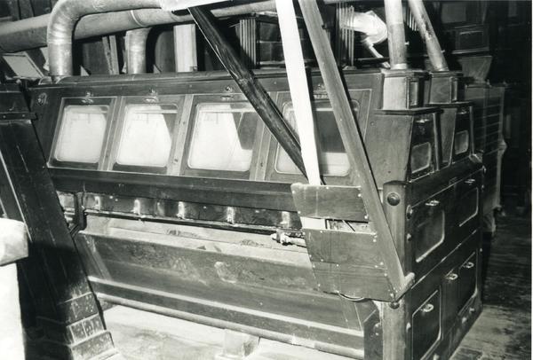 ‘The 12 sieve trays have a coarse sieve at the top and the sieves get finer as they approach the bottom of the unit. The coarsest sieves are a wire mesh with holes about 5/64 inch (2mm) square and the finest are nylon (formerly silk) that can hardly be seen…Under each sieve is a brush running on an oval track. This brushes the underside of the sieve and causes the stock to be brushed through the sieve. If the stock is fine enough it will fall through the sieves and pass into the flour worm ready to be bagged, otherwise it overtails (passes over the sieve) and goes back to a roll.’ (Walker, p.11)