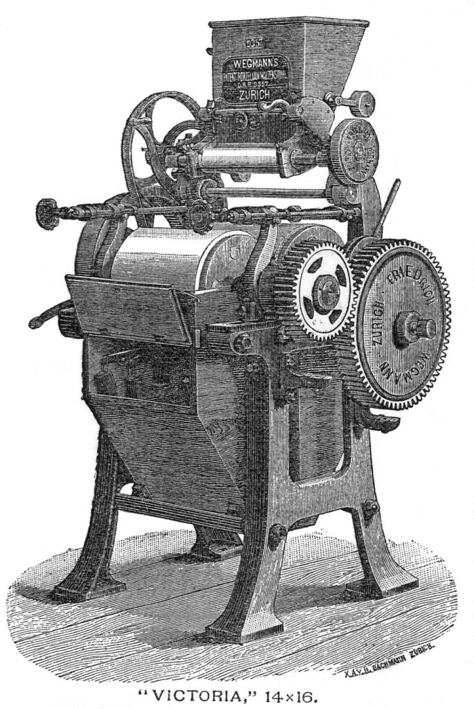 Contemporary to the developments made by Ganz & Co. in Hungary was the work done by Friedrich Wegmann of Naples who invented a porcelain roller mill for reducing semolina and middlings. By the mid-1870s these machines could be found throughout Europe with the first arrival in Britain taking place at the end of 1876. The impetus behind the trial of the machine in Britain can mainly be attributed to one man, Oscar Oexle. He had enlarged the Walzmühle workings in 1868 and then become an agent for Wegmann’s machines. During 1876 he wrote a series of articles in The Miller advocating the use of porcelain rollers and prompted a trial to take place in London in December 1876. After this trial, around 30 machines were ordered in Britain and A. B. Childs was appointed Wegmann’s agent in Britain. By 1881 Wegmann claimed to have sold 6000 machines in Europe despite his machines not being as popular in Britain where the chilled cast iron rolls were more commonly used. Nevertheless, together these two inventions had a major impact on the milling industry in Europe and was the impetus the industry needed.