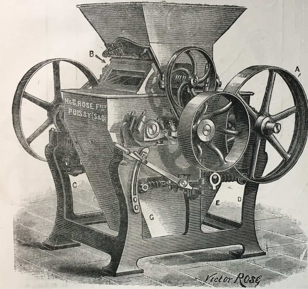 During the next five years members of the firm travelled extensively, visiting numerous mills in France and other countries. They returned home convinced that a great future lay before wheat cleaning machinery. They were all struck by the irreparable injury that flours ground from high class wheats received from the contamination with earth and other foreign bodies which were originally mingled with the raw grain and were triturated past all hope of elimination in the grinding process. They acquired the French patent of the “Childs” aspirator and at once made it their business to push this celebrated wheat cleaner with all their energy. The Tarare Americain (American Winnower), as this machine was called, met with great success and its makers were soon in a position to quit the modest workshop which they then occupied at Maromme near Rouen. They then started on a more ambitious scale in the ancient town of Poissy, just twenty miles outside Paris and on the railway connecting Rouen and Paris.
