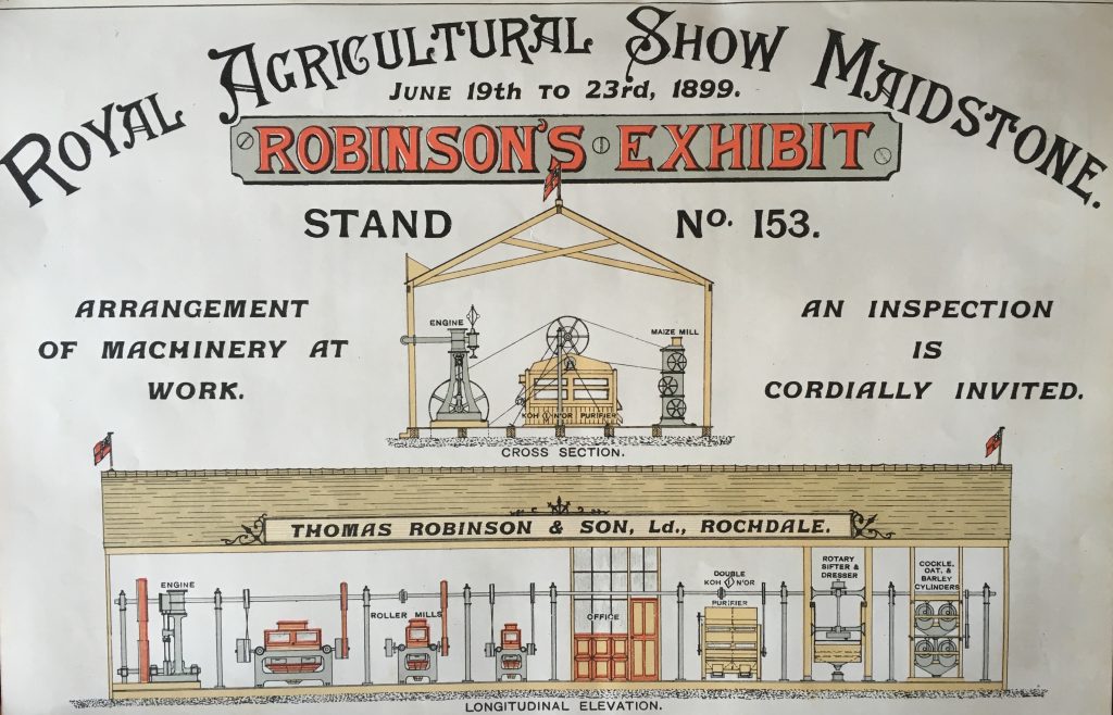 In 1882 a consignment of flour milling machinery arrived in England in a poor and damaged condition. Robinson’s were hired to repair the machinery and, as a later Director explained, ‘Seeing in this new field an ideal opportunity for further expansion, the company took comprehensive steps to enter the market’ (Povey in Jones, p.110). They embraced this new industry with great speed. By 1883 they had started manufacturing their own flour milling machines and the following year claimed that ‘We can fully equip a full roller mill with our own machinery throughout’ (Jones, p.112). At this stage they were mainly being employed by mills of small or medium size but were nevertheless being hired, as in March 1885, they printed a list of 11 recently erected plants. These included plants for the Rochdale District Cooperative Corn Mill Society and the Halifax Flour Mills Society.
