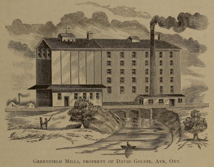In 1844, John Goldie with his wife, two sons and four daughters, left their native Scotland and moved to Canada, two years after his two eldest sons had immigrated to America. In 1848 he built an Oatmeal mill in Ayr, and a year later, constructed a flour mill on the site of his old sawmill. This Greenfield Mill would be one of the mills installed with the roller process in 1881, although it is his sons who have to take most credit for this.