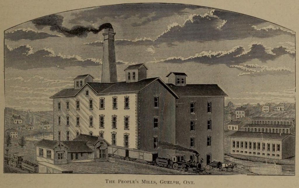 John Goldie’s four sons all ended up involved in the milling industry. His eldest sons, James and William, moved to the United States in 1842 where both worked in a variety of jobs. After the rest of the family moved to Canada, William joined them in helping build Greenfield mill. James did not move to Canada until 1960 when he built Speedvale flour mill in Guelph with William. After this partnership ended, James built the People’s Mill in 1867, which, by the time The Canadian Miller published an article about it in 1892, was working on a full roller system with a capacity of 500 barrels per day.
