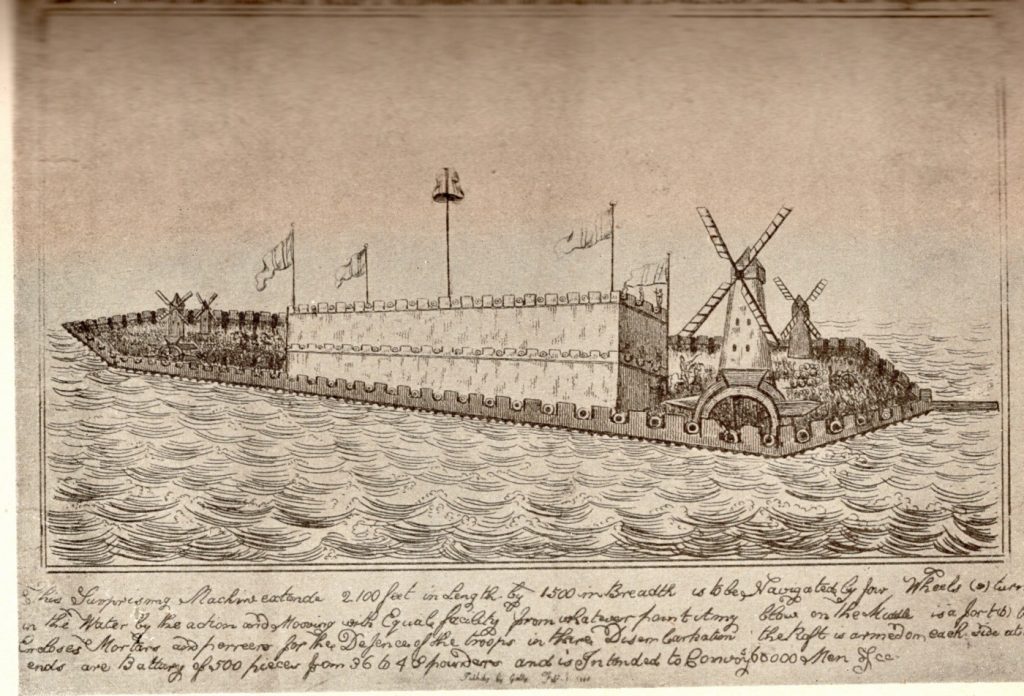 Remarkably, whilst these depictions of rafts are clearly absurd, there have been some attempts at creating boats powered by windmills. Some are less direct and have used them to produce electricity which is then used to drive the underwater propeller; but others have been directly linked through a drive shaft to the propeller. Indeed, with growing concerns over the environmental impact of international shipping and with new designs such as the use of windmills, large kites and solid sails, we may yet see a ship that resembles Napoleon’s folly.