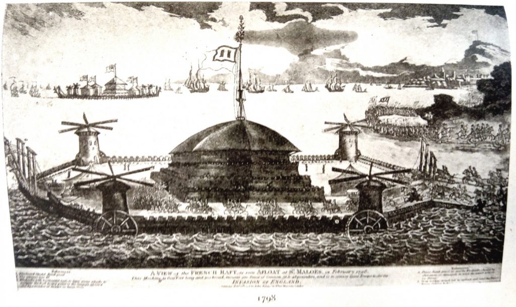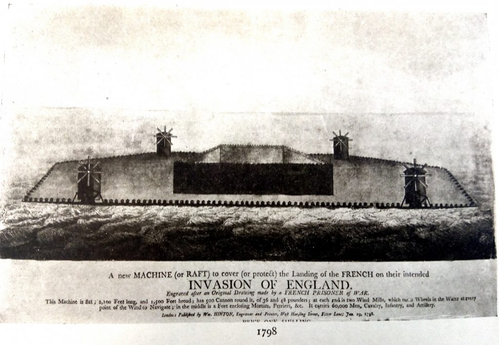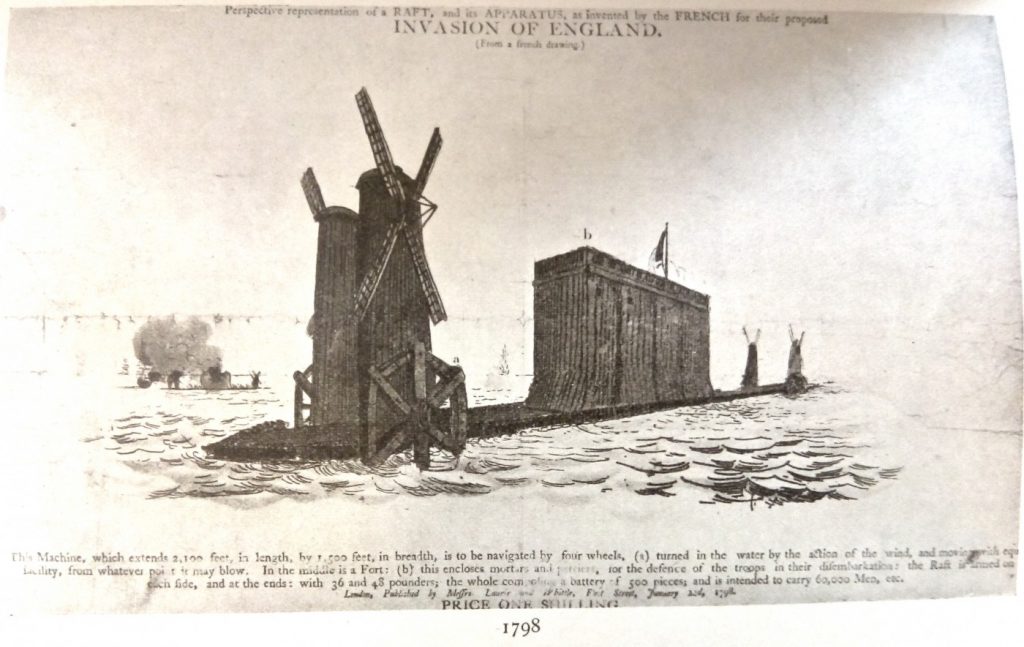 As it is wont to do (and was, even in the 18th century), the press took hold of the nation’s anxieties and began publishing satire about the supposed rafts full of military troops which would land on British soil. A variety of cartoons and reports were produced: the depicted rafts were all were impractically large and capable of carrying a very large number of soldiers, had some form of fortification in the middle and used wind-powered paddles as propulsion. These reports were all said to be supposedly from either ‘a prisoner of war’ or ‘a visitor recently from France’ to give them some form of credibility. The rafts quickly entered the public imagination and became a way of depicting the invasion threat in a comical manner, fuelled by Britain’s love of poking fun at the French (and perhaps also as a defiant stand against what must have been a very real and imposing threat). In the end, however, this invasion never came – Napoleon’s hopes dashed by Nelson at Trafalgar.