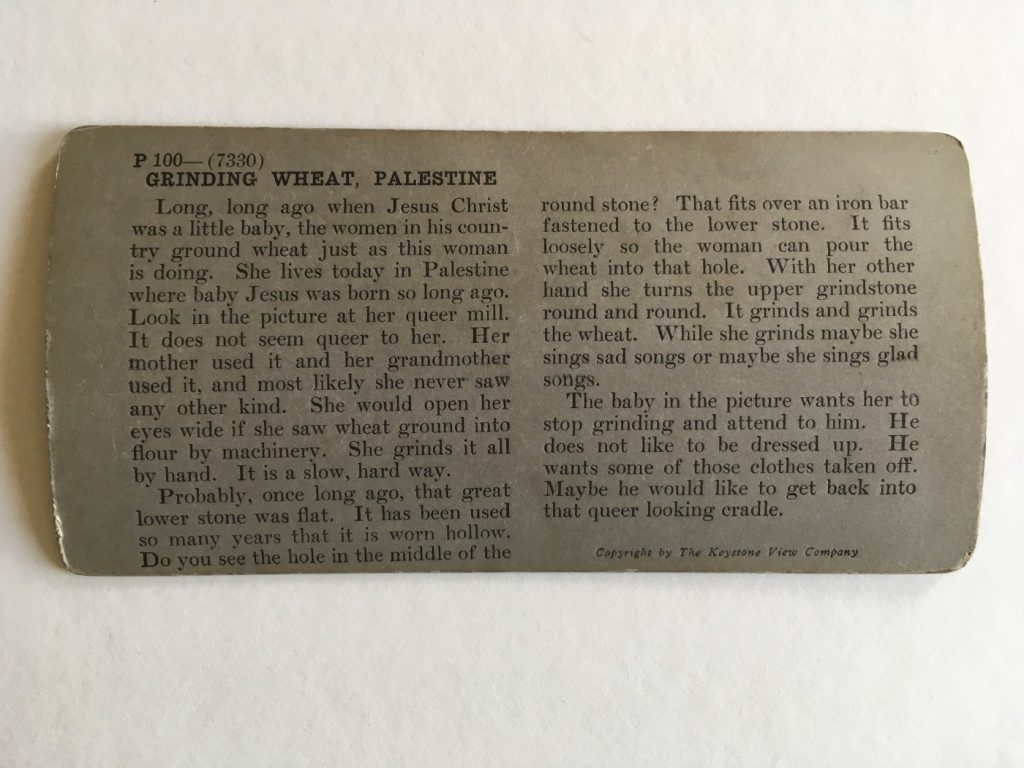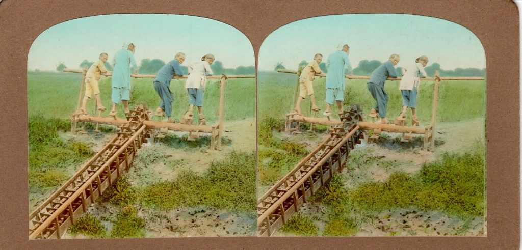 Apt to the title, this is really a double Gem as you can’t have the stereoscope without a stereograph, and vice-versa. We also have a small collection of stereographs at the Mills Archive (obviously mostly on a milling theme!). The one you see in the photo combines both a milling and a foreign theme, depicting a family of Chinese peasants using a treadwheel to irrigate a rice paddy. It has been hand-coloured using a technique called hand-tinting to increase the novelty of the image. Other stereographs produced bearing a milling theme include Cuban sugar mills and Egyptian saqiyas – all of which satiated the Victorian and American thirst for novelty.