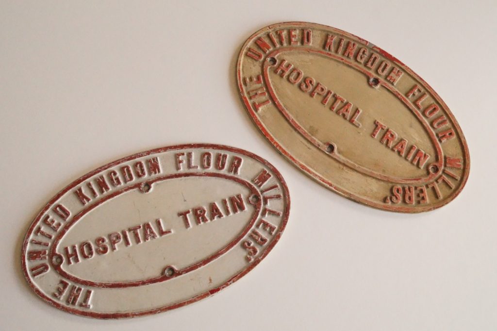 These two identical oval plaques once decorated two railway carriages of a First World War Ambulance Train, which played a crucial role in the support of troops on the front line. The trains, which transported wounded soldiers from the trenches to nearby hospitals where they could be properly cared for, were equipped with bunks for casualties and treatment rooms where nurses could provide vital immediate care from life-threatening injuries sustained during battle. Trains 16 and 17 were donated to the war effort by the United Kingdom Flour Millers, whose considerable fundraising effort paid for the trains to be converted and fitted out.