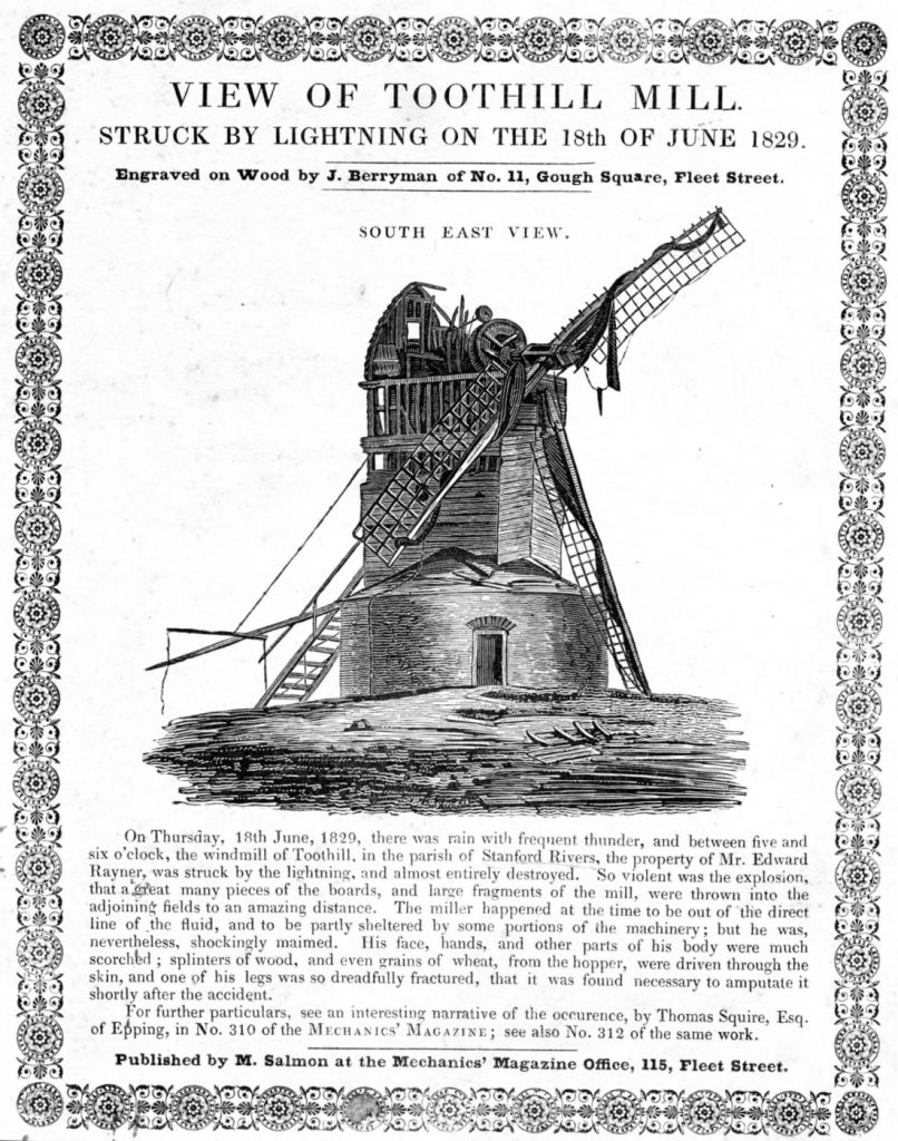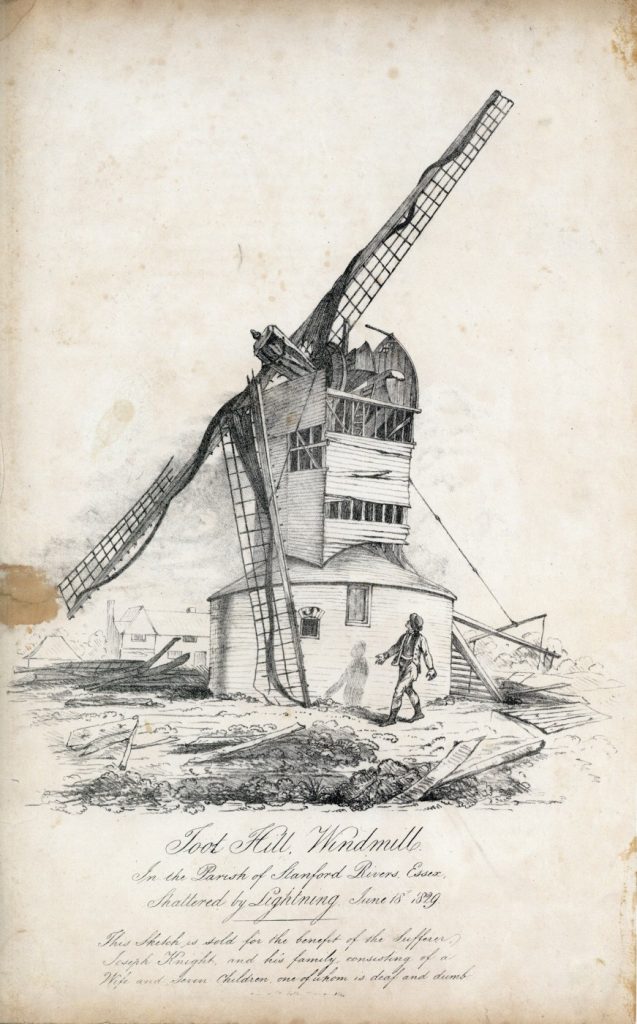 On Thursday 18th June 1829, a vicious thunderstorm spread its way across the East of England. With rain lashing down, wind whipping across the landscape and the sky filled with the bellow of thunder, all it took was one bolt of pure electricity to cause immense damage. Joseph Knight, the miller of Toot Hill Windmill in Essex, was unfortunate enough to be in his mill at the time of the storm, when a lightening bolt caused a catastrophic accident. The miller’s wife recalled hearing a ‘hissing noise and a sound like artillery as the lightning struck the mill, and then an overwhelming smell of sulphur. Suddenly she heard the bloodcurdling screams of her stricken husband, and running out to the mill, she found him in a horrific state.