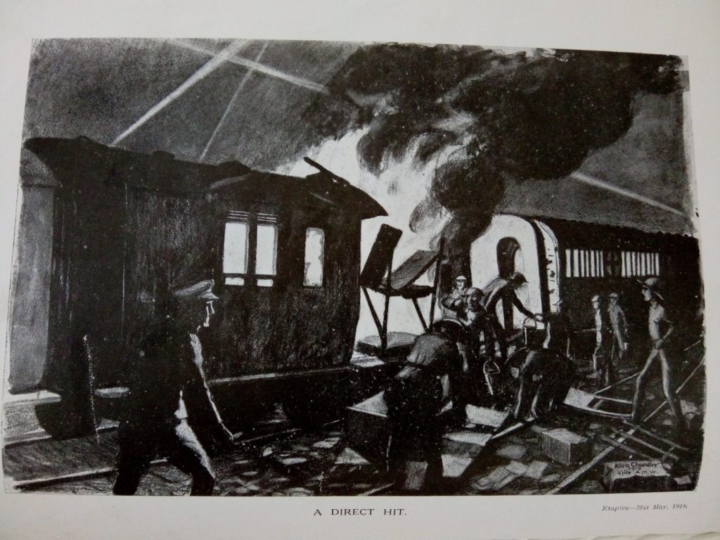 ‘A couple of terrific explosions, followed by the crash of falling glass announced the arrival of two bombs opposite “H” kitchen. They fell in a shed, which took off some of their force, but the whole side of the coach was wrecked. By a piece of singular good fortune no one was killed. The mess-room was crammed with patients and every part of the train filled up, yet the only casualties were Gibson, who was cut about the head, and Stanley, who was hit in the back by a piece of wreckage.’