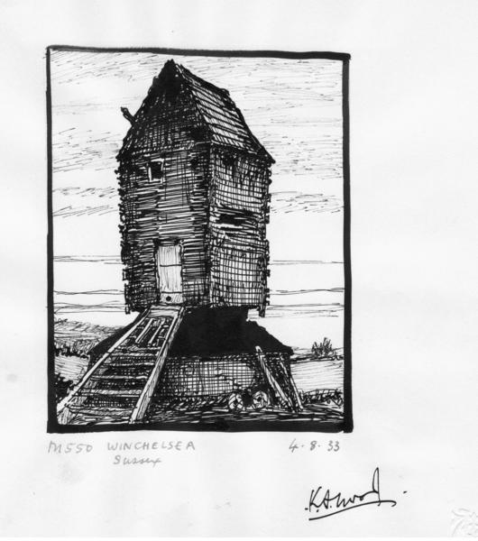 St Leonard’s Mill was a wind-powered corn mill built around 1760, and was in operation until the late 19th Century. It fell into disrepair and despite a number of restoration attempts, it ultimately collapsed during the storm of 1987 – leaving behind only a millstone, which was salvaged and used in the restoration of Lowfield Heath Windmill. According to Brangwyn, the mill has a somewhat macabre past: