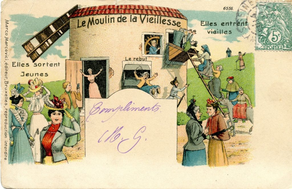 This postcard was produced by the Belgium publisher Marco Marchovici in the early 20th century. The illustration is of elderly women entering the ‘Mill of Old Age’ on the right. On leaving the mill they have been transformed into glamorous young ladies. In the middle of the mill there is a chute for some poor women who have been rejected in the process!