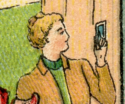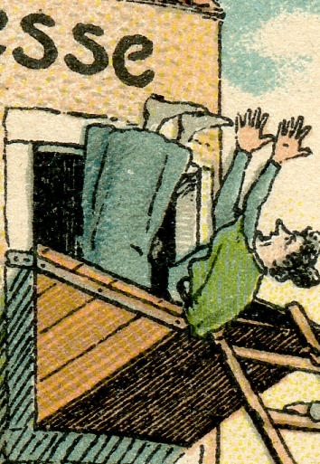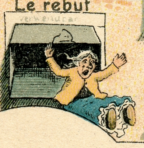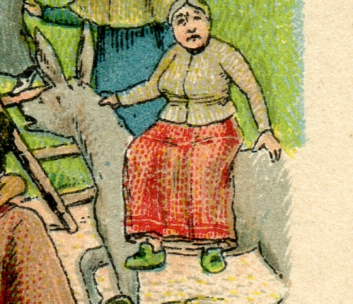 The postcard plays on a common theme of the transformative power of mills – another example being the German reservist mill, another one of our Gems. However unlike other examples, this portcard is less serious and far more charming: the more you explore the image, the more you are treated to humorous episodes. For instance, the rather despondent donkey, the elderly lady falling into the mill in a rather alarming position, or the young lady admiring herself upon emerging.