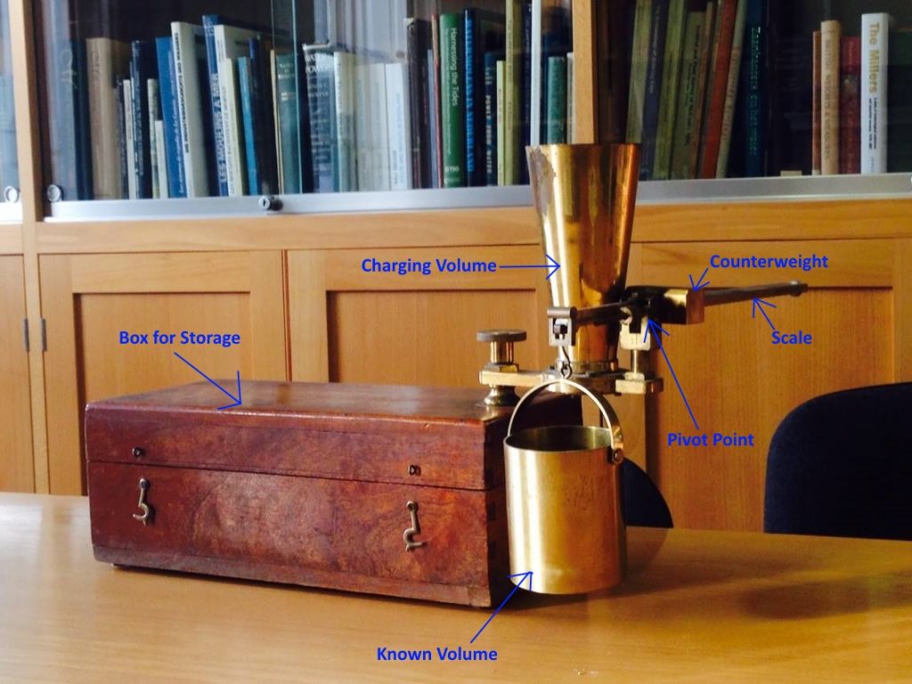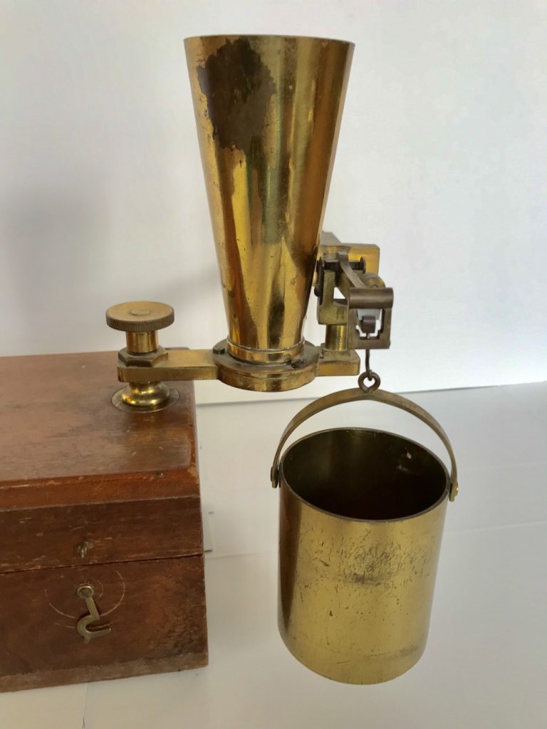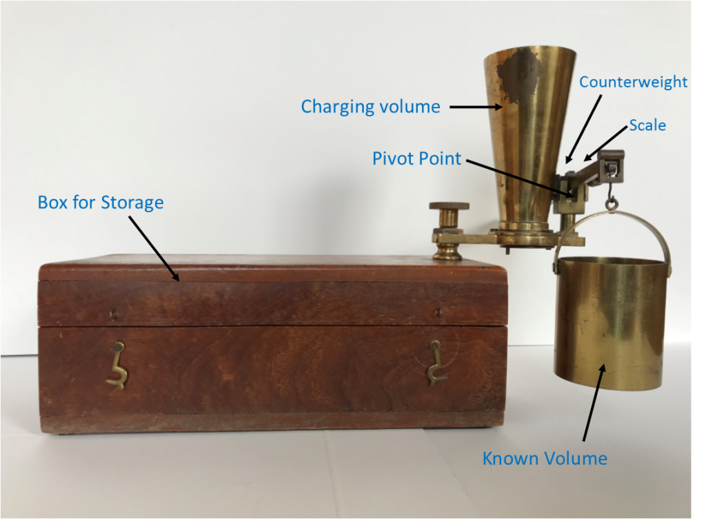 Later versions of chondrometers such as this one would have a conical funnel or charging volume, allowing you to fill the known volume in a more controlled manner.