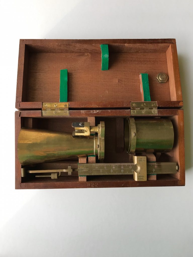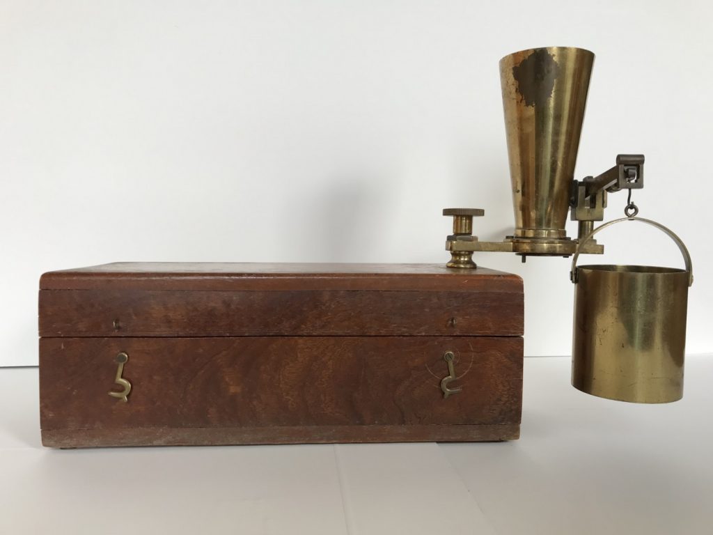 This specific chondrometer belonged to the miller at Crayford Mills in Kent, and was used all the way up to the 1980s. It was made by the firm Corcoran and Son, established by Bryan Corcoran in 1805. The firm gave evidence for a petition relating to the Weights and Measurements Act and following its imposition, they were one of several companies to develop chondrometers.