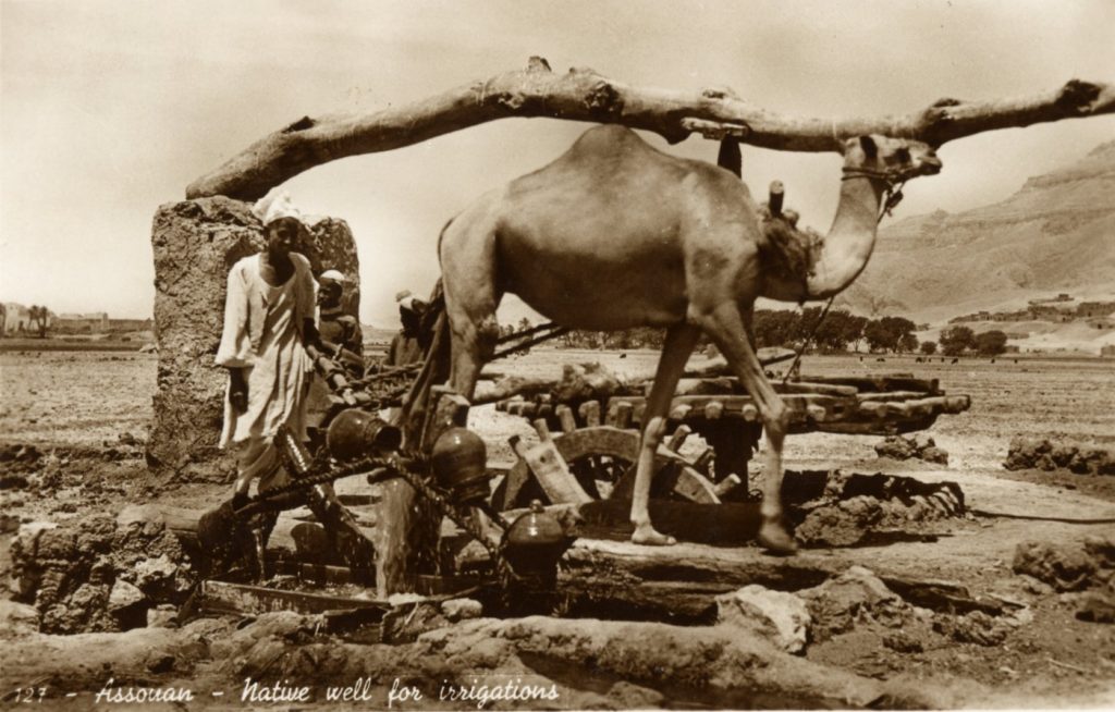This postcard shows a camel-driven Saqiya or Sakia. They were once a common sight across the Middle East and Asia, and in some areas are still in use today. They were animal-driven machines, with which water could be raised from one level to another for the purpose of irrigation. The name ‘Saqiya’ comes from the Arabic as-saqiya ( سَاقِيَة ), meaning ‘that gives water’.