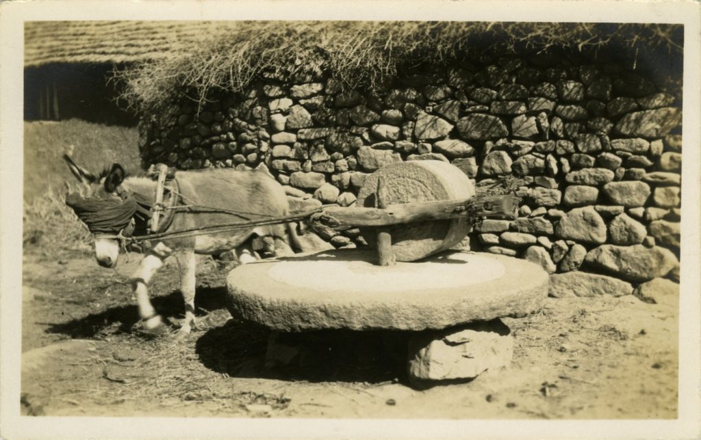This is a donkey-powered rice mill in China. It makes use of an Edge Runner Stone rather than using a pair of flat millstones. To work it, the rice would be placed on the stationary lower stone. The donkey then drags the top vertical stone around the edge of this lower stone, thus grinding the rice. The produced flour would then be brushed into a bowl. You can see in this photograph the lady on the right holding a brush for this purpose.