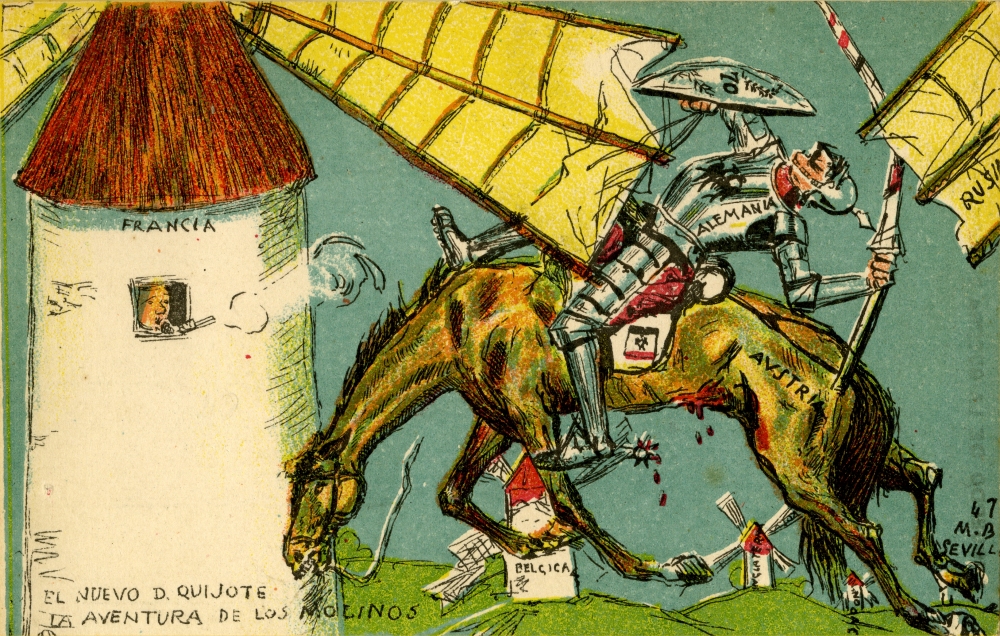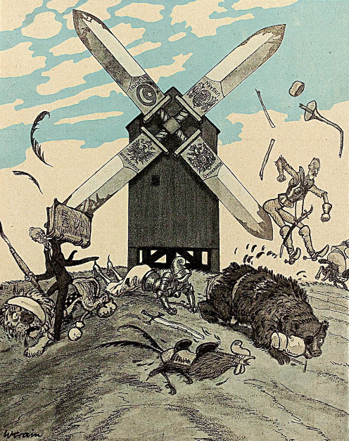 During the First World War, this phrase was often visually represented by artists in order to make symbolic remarks about the futility of war. This postcard from 1915 is titled ‘The New Don Quixote: The Adventure of the Mills’. It depicts a countryside scene showing six windmills, each one labelled as a country that made up the Triple Entente and its allies – with the largest windmill in the scene symbolising France. The windmill is being charged at by a knight on horseback: the knight, with his Prussian moustache and helmet, on a saddle marked with the German Imperial flag, represents Germany, with the horse he rides symbolising Austria. The postcard mocks Germany and Austria, showing them as wasting their efforts by pursuing an imagined impossible goal, that of defeating the French and their allies.
