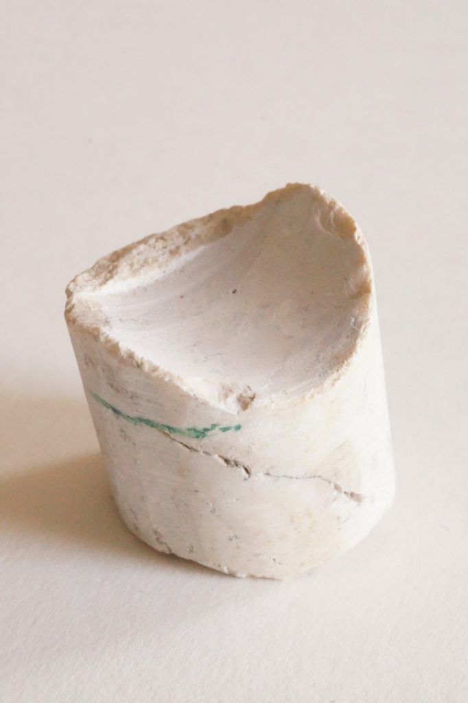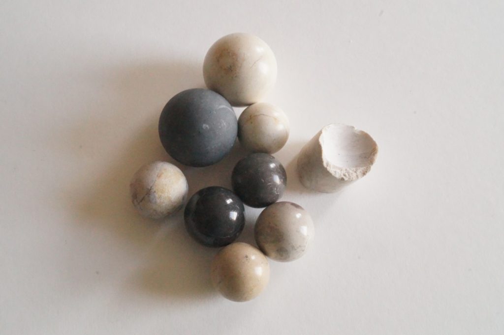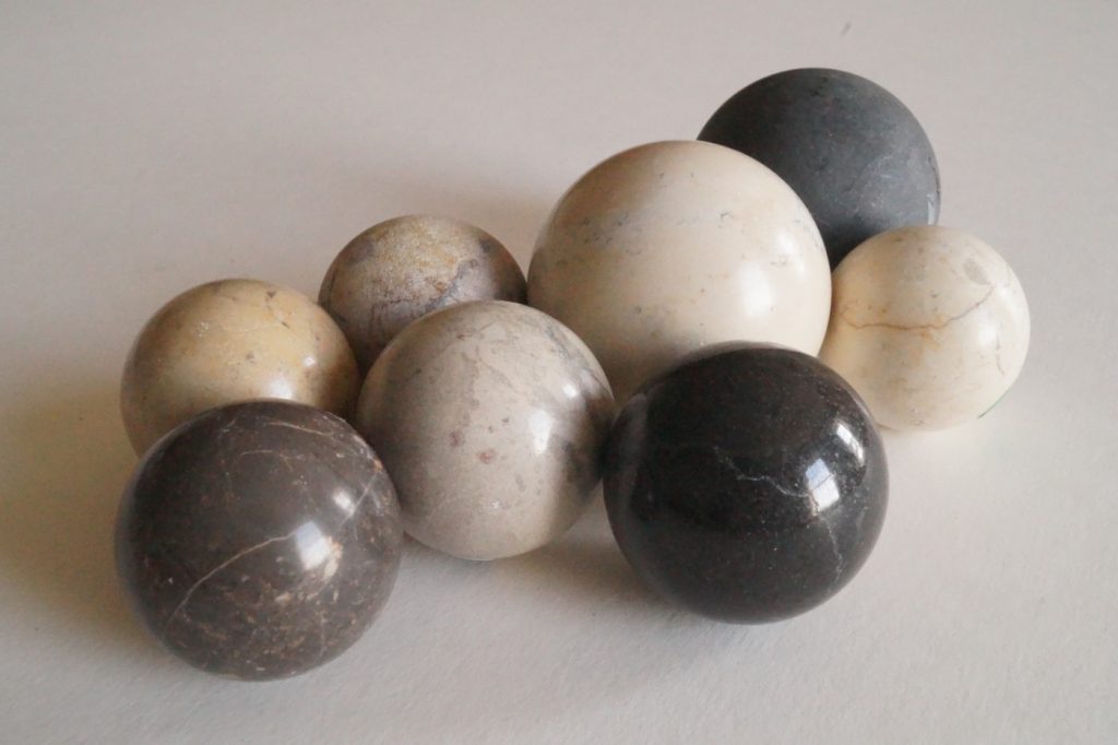 These marbles have been produced using the power of water. The way they are made is similar to how you would shape a ball of Play-Doh by rolling it between your hands to form a ball, but with marbles it is done by moving a chunk of marble between two large stone surfaces. Small chunks of marble are placed on a stone which has a circular groove cut into it, and another stone rests on the top of these marble chunks. This upper stone is turned by a horizontal water wheel, which causes the marble chunks to roll around the groove, producing perfectly smooth and spherical marbles.