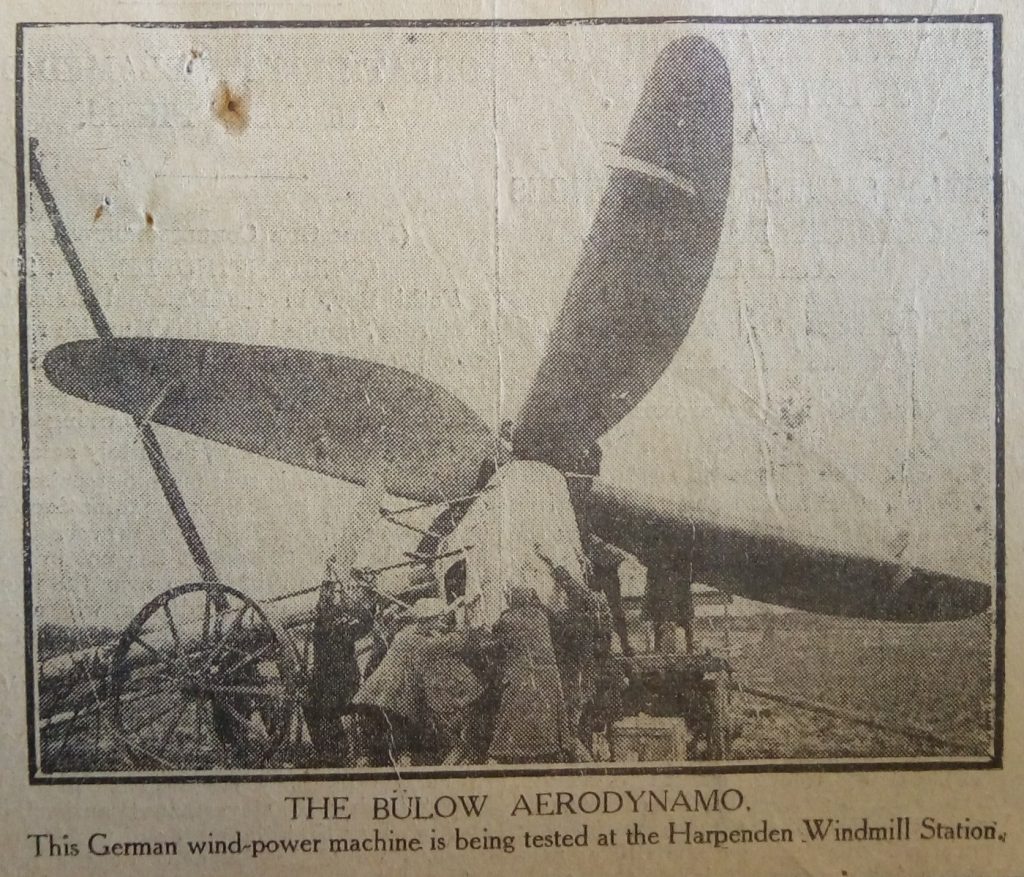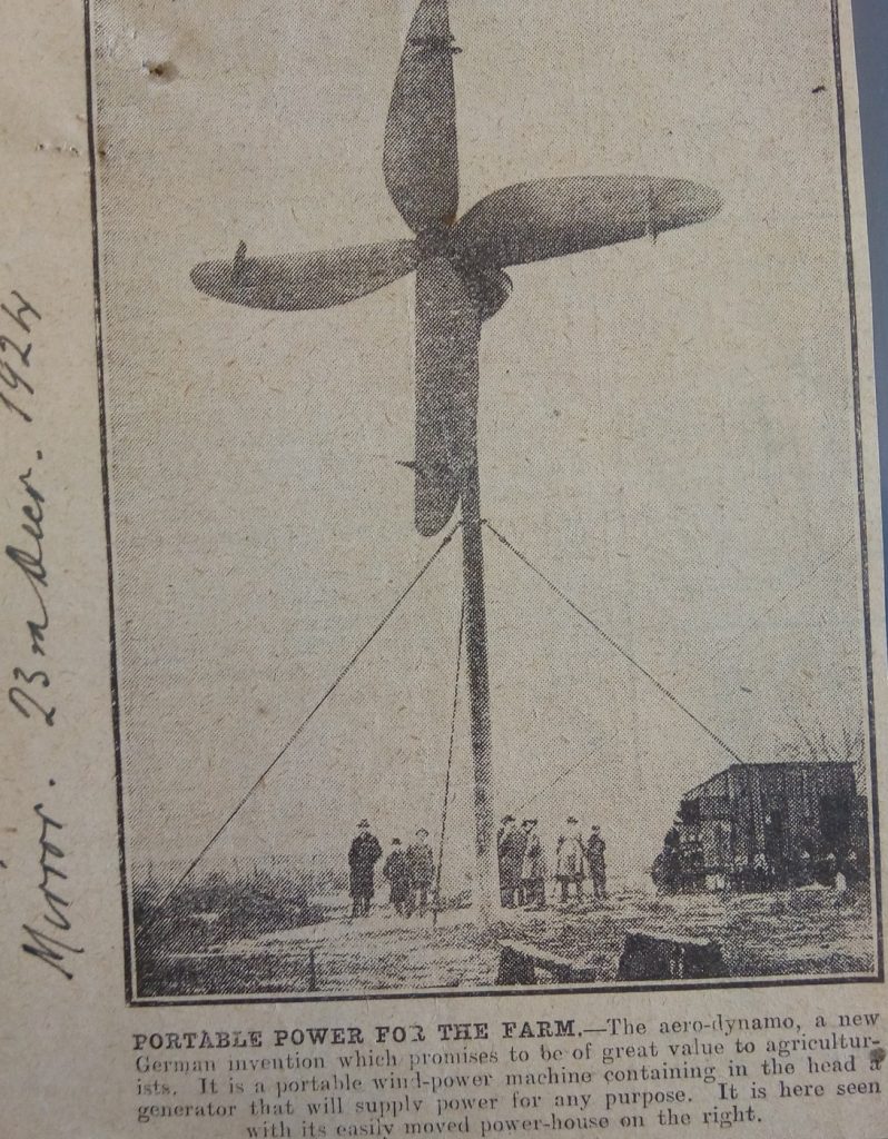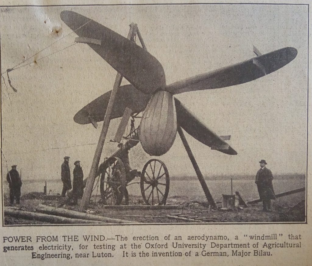 Major Kurt Bilau was himself an interesting individual. Serving as an artillery officer for the German Army during World War I, he was awarded the Iron Cross. It is likely from his time in the army that his interest in windmills was peaked, as they were often used as observation posts and landmarks for targeting. Following the war he worked in Göttingen Aerodynamic Institute where a newspaper report in the Mirror 1924 states that “while working one day in his laboratory at Göttingen he saw in a flash that windmill construction had for thousands of years been all wrong”.