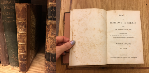 The spine declares the book to be “Laing’s Norway” in small gold lettering. On the first page the full title is provided: “Journal of a Residence in Norway during the Years 1834, 1835 and 1836: Made with a view to enquire into the moral and political economy of that country, and the condition of its inhabitants”.