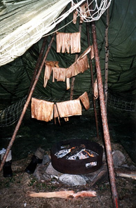 Bark bread is in fact made from the inner rind found next to the wood of the tree. This rind is taken off in flakes and steeped in water to remove its bitterness. The flakes are then hung on a rope to dry in the sun (or sometimes perhaps over a fire as the below image shows?) and would resemble sheets of parchment. Then once dry, the flake would be pounded into small pieces, mixed with corn and ground into meal on the hand-mill or quern.