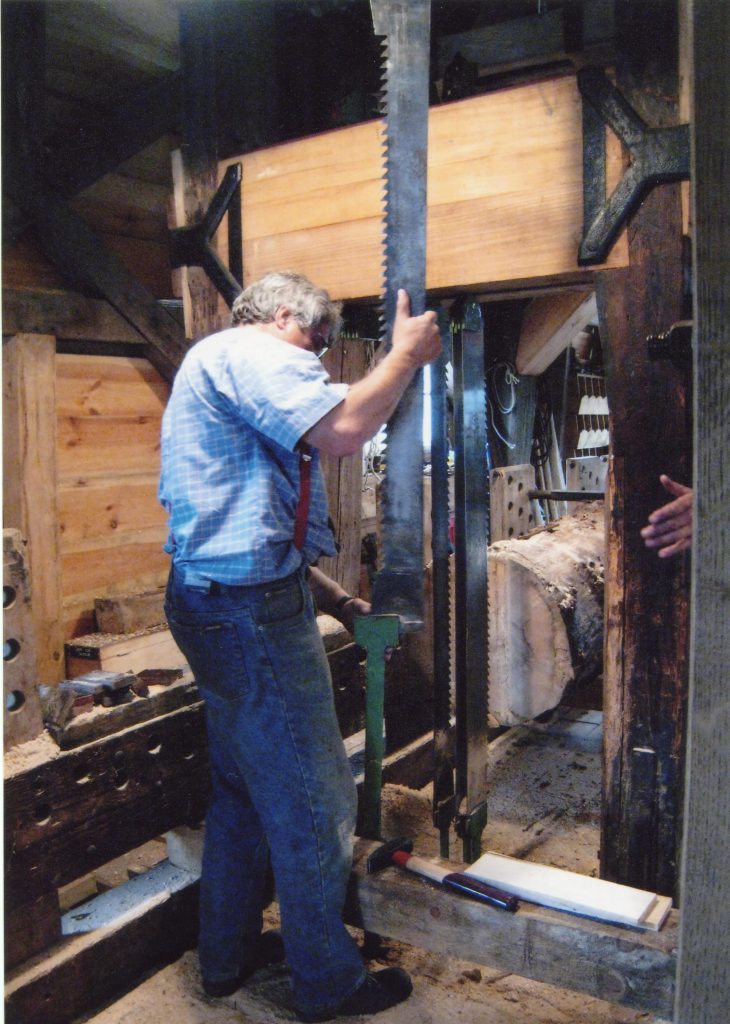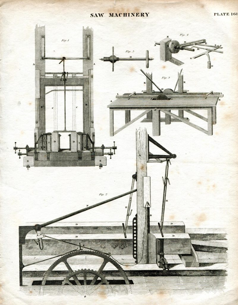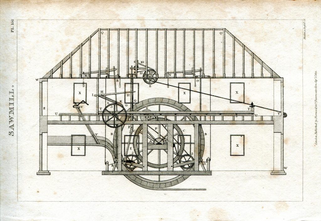 There are two types of saw mills, the vertical and the horizontal, depending on which way the saw blades operate. The saw frame consists of several saws, each being 9 or 10ft long, and move up and down as they saw through the timber. The saws in the mills could be adjusted to cut any desired thickness. Gearing allowed various functions which included getting the timber into the mill to the actual sawing itself. Spare saws would be kept in the mill for replacement while others were being sharpened or needed changing over for work on different types of hardness of woods. On average, saws would be taken down and sharpened around every 50 meters of wood cut.
