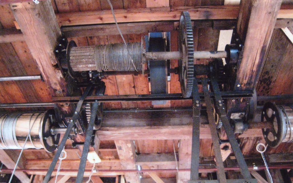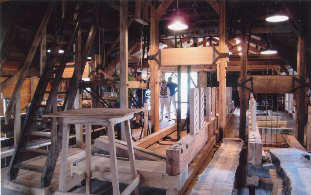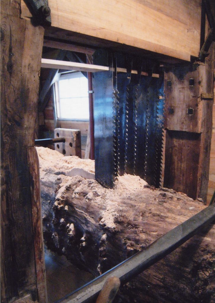 Once the timber was near the landing stage, it was attached to a chain and using the power of the windmill sails, dragged into the mill for sawing. The mill had three saw frames each with multiple blades. A log was turned into planks in one pass through the saw. Many spare saws were hung in the mill as they often needed taken down for sharpening. Each time a blade was changed over it took around 45 minutes. Once a log had been cut the planks were stacked outside in an open sided shed.