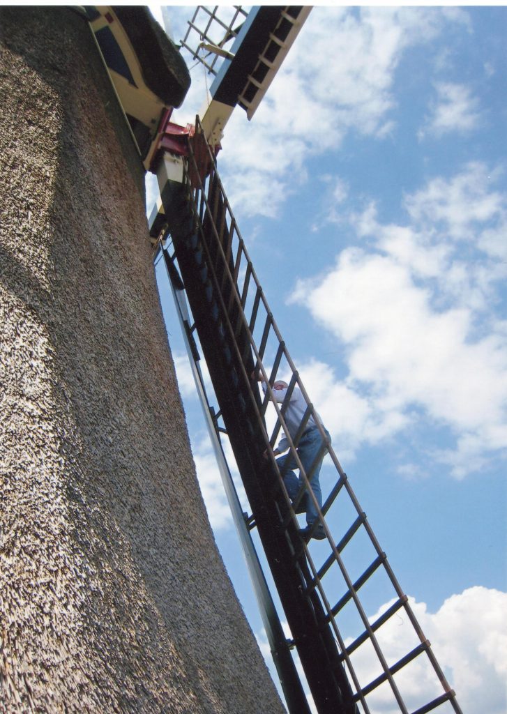I was privileged to help run the mill on a TIMS symposium visit. At first I was rather disappointed as I put my name down to help at an oil mill (for linseed oil) with edge runners turned by donkeys. But after arriving at the windmill I was happy to get involved. The first job was to set the sail clothes on the windmill sails, then the job of hauling the baulks of timber out of the water next to the mill. This was first achieved by using a long pole with a rather vicious hook on the end to secure the tree trunk which had been in the water for many months.