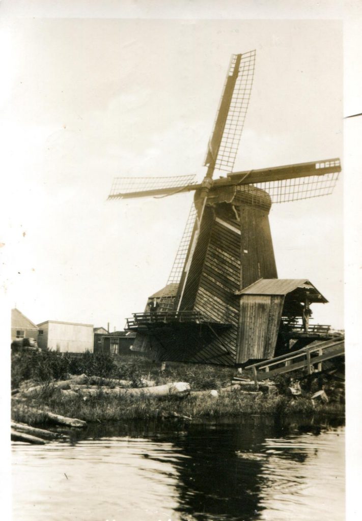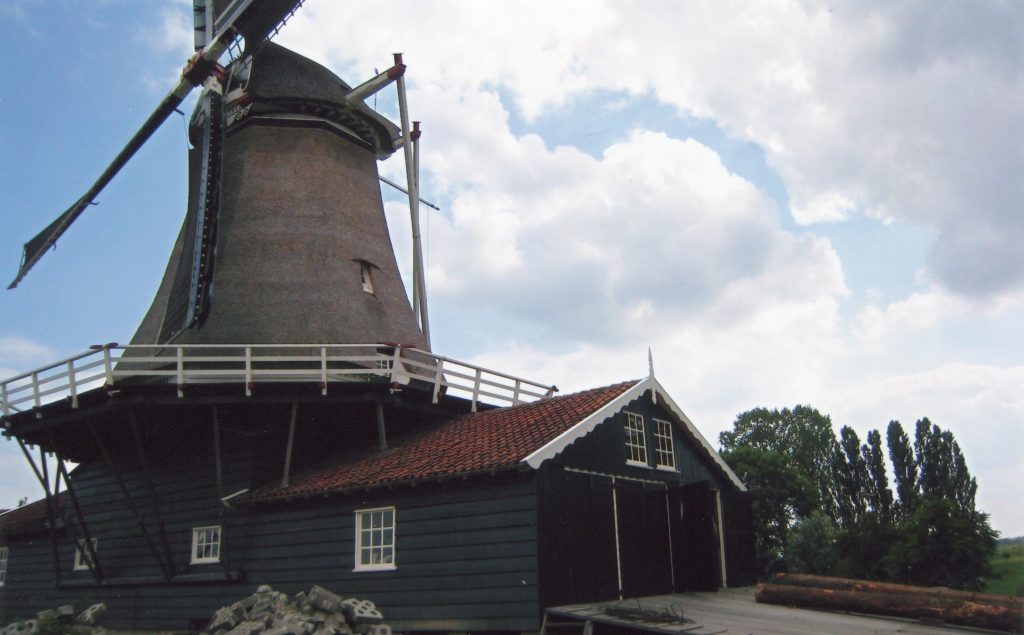 The mill I helped operate was the Bolwerksmolen sawmill, Deventer. It is on the west bank of the river Ijssel, near the Wilhelmina Bridge. It was built in 1863 and is an octagonal thatched smock mill standing on a square barn with the slipway which allowed the logs to be pulled out of the water into the mill.