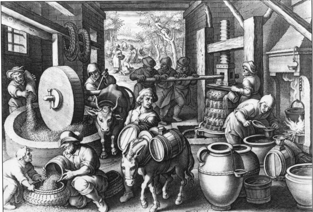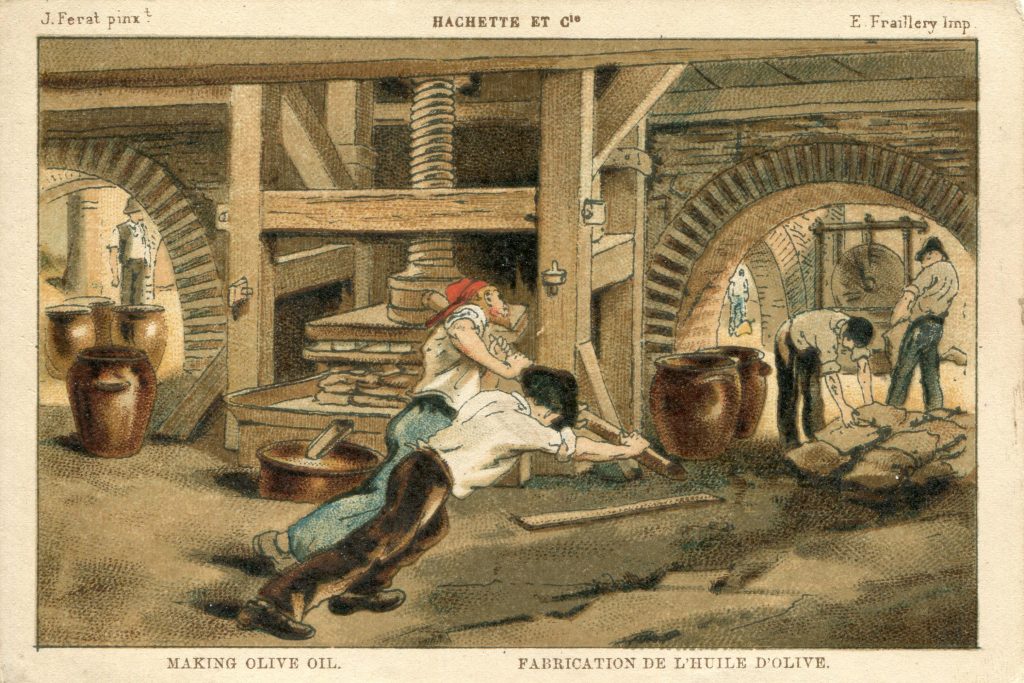 In the Holy Land oil was essential for food, fuel for oil lamps and as an ingredient for soap. Here the mortar and pestle arrangement was used from early times, developing into complex screw presses. In the museum at Tel Aviv there is a working oil mill using 20th century stone edge runners, made of granite, pulled round by mule; this was still in use until the 1970’s, the process unchanged from 323 BC.