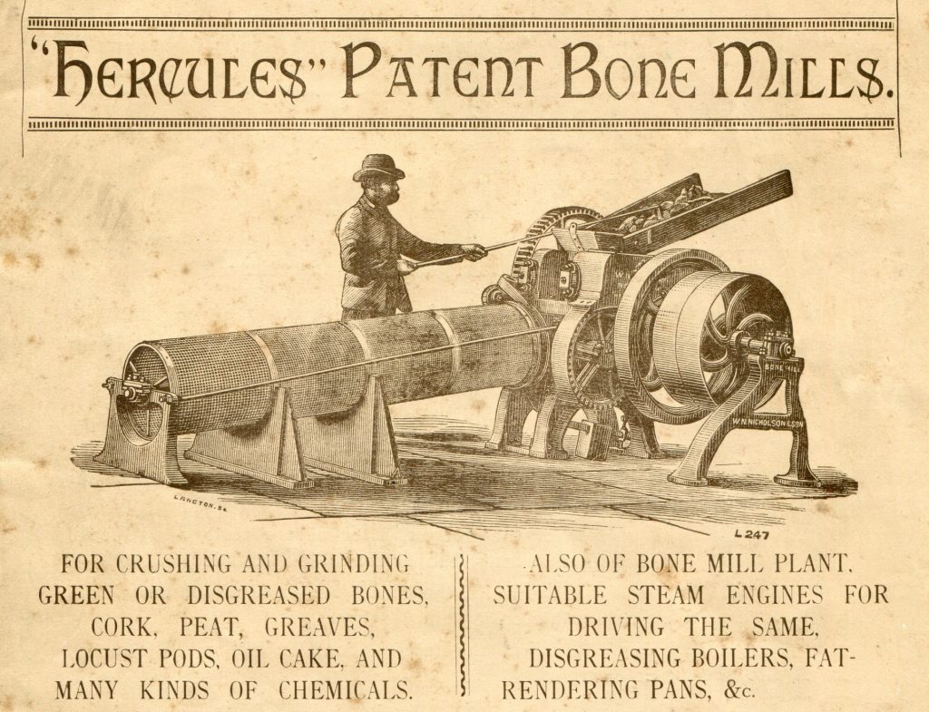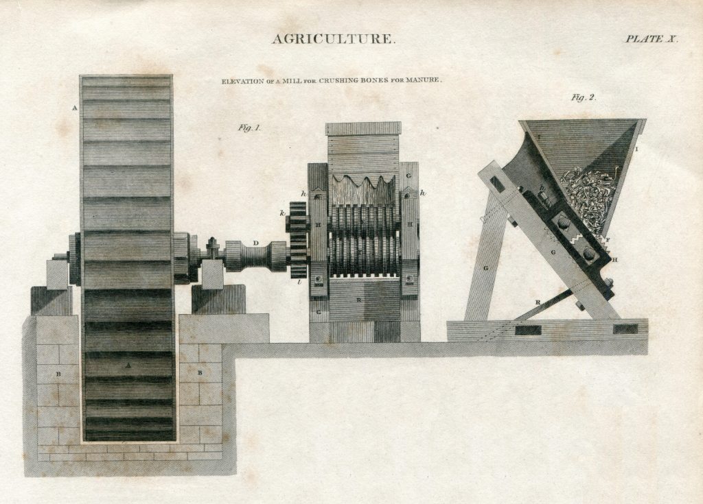 Bone mills were designed to crush animal bones either for fertiliser for farm use or for glue. Josiah Spode discovered it could be used for bone china. Bone mills were usually water powered, although windmills in the UK were also known and a paper on the bone windmills of Sweden has recently been written.