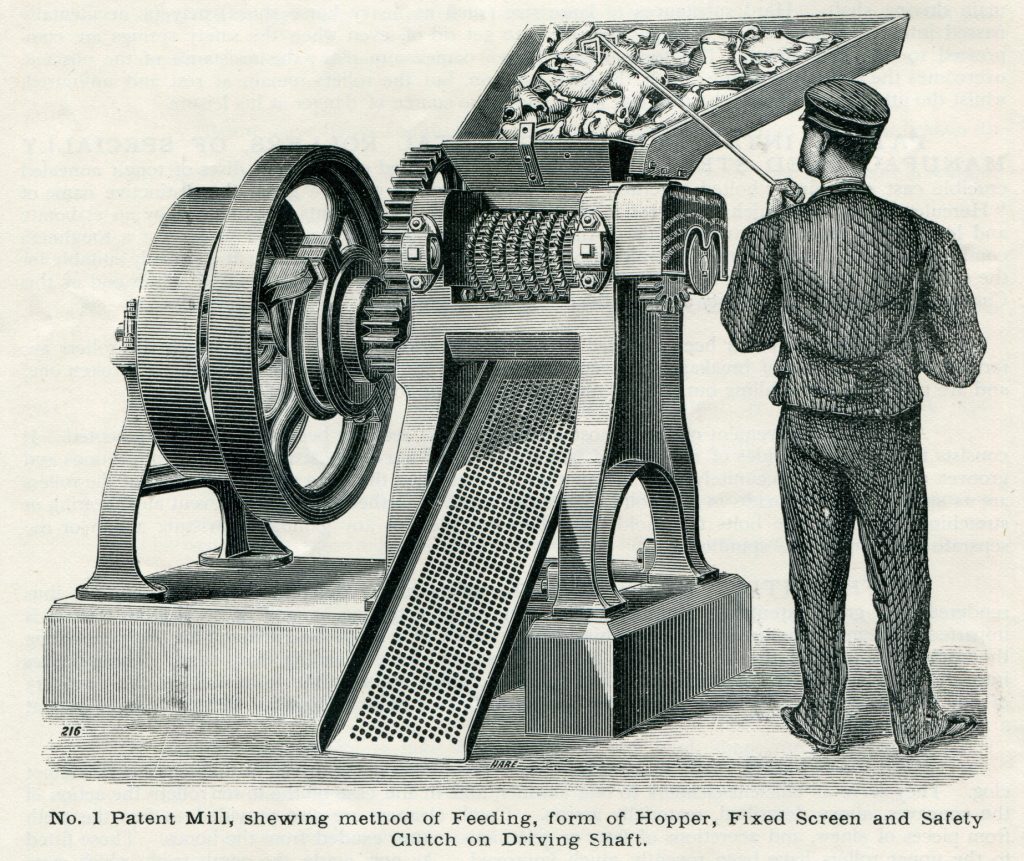 Some millers would purchase bones ready prepared for calcining to avoid the threat of diseases such as anthrax. Many mills would boil the bones themselves with glue being a saleable by product. Local bones would have been purchased early on in the industry, but then they would be imported from India, Pakistan, Egypt and China. Cattle bones are most preferable, shin bones tend to have a high mineral content and horse bones give the ware a greenish hue. Some millers would tell stories of human bones being included in consignments and various whale and elephant bones have been saved from the grinding process. Grinding would have been done either in pans, (wet pan grinding) or with stamps raised by cams and allowed to fall under gravity onto the bones being processed (this was soon discouraged due to the dust it created, causing silicosis) or a set of edge runners or even millstones.