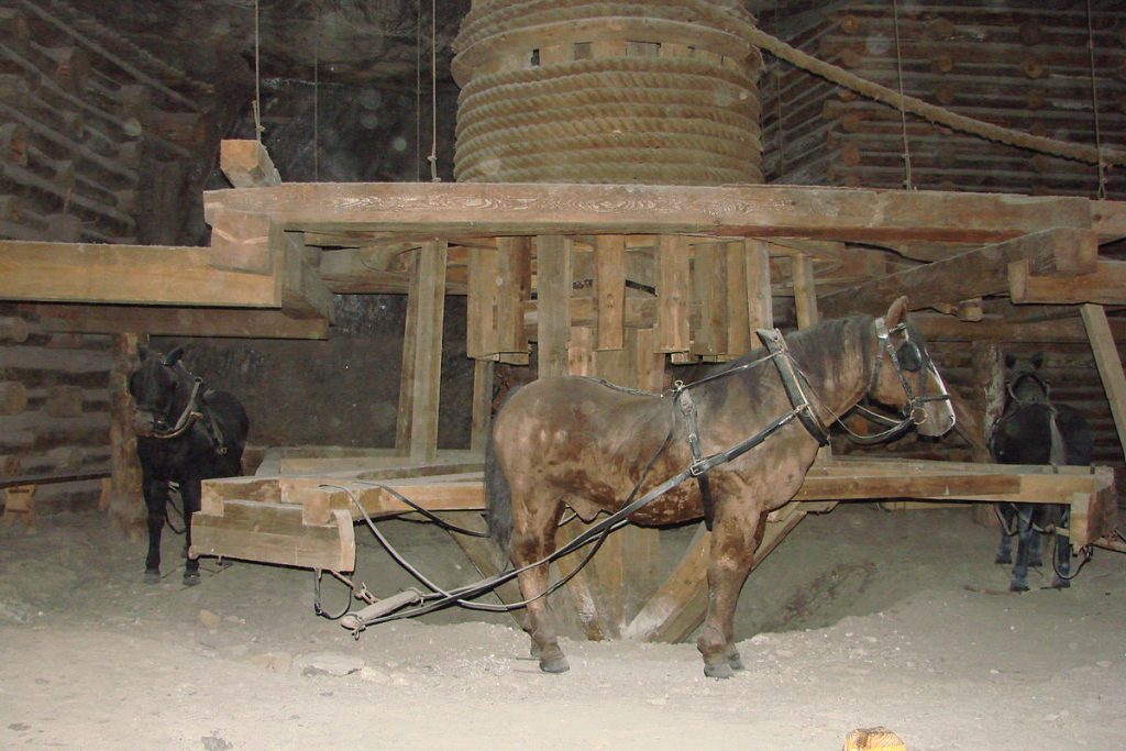 The salt mine at Wieliczka in Poland was established in the 13th century – at first brine welling up to the surface was collected, and later shafts were dug to extract rock salt. A Hungarian horse gear and a Saxon treadmill were used for hauling salt to the surface.
