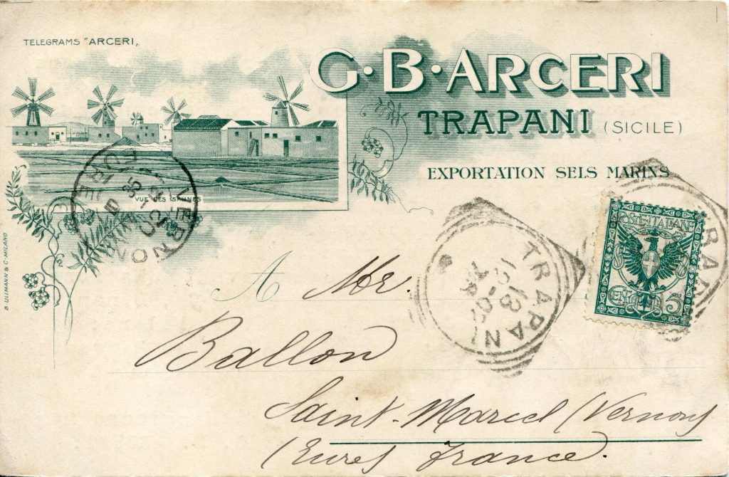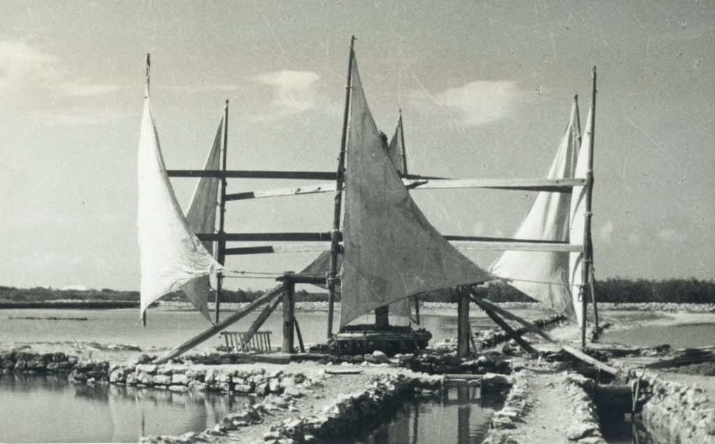 Salt has been produced in western Sicily for 3000 years, beginning with the Phoenicians. The high salinity of the Mediterranean and a climate with a lot of wind and sunshine and little rainfall makes the area highly suited to salt production. The windmills on the salt pans near Trapani and Paceco are still in use today. They have a stone tower with a conspicuous red cap, and six trapezoidal sails with cloths fastened to turn them into the wind. Some grind salt to powder, and others power Archimedes screws which transfer water from the salt pans back into the sea. In summer the salt is harvested.