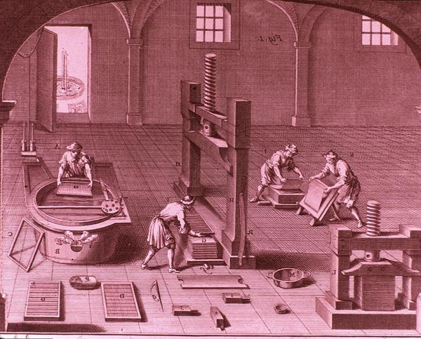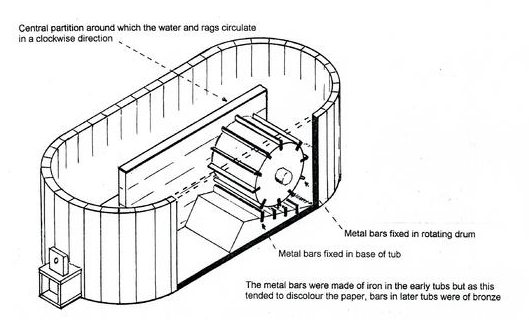 From the 15th to the 18th centuries, paper was made by hand in small watermills. The process involved the mashing of rotted rags into a pulp by stamping hammers, which was then placed into a vat of lukewarm water and formed into a sheet of paper on a wire meshed mould. The water was then pressed out and the sheets air dried. Eventually more advanced paper making machines took over in the 19th century.
