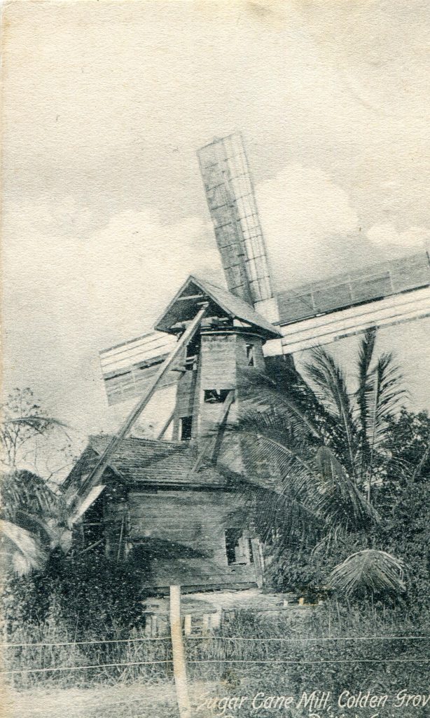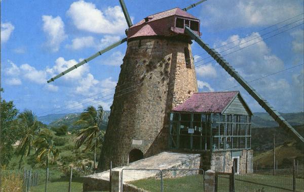 The windmills in the West Indies had their own terminology, the sails being called ‘points’. The windmills did not have a brake wheel, but depended on an operator to turn the mill, via the long tail pole, to 45 degrees out of wind when they wanted the mill to stop work. As well this the windmills had rings fixed at intervals into the walls, into which the two bottom sails (in the position of St Andrews cross) could be secured. During the hurricane season the points were taken down in case of damage, and stored until they were required to work again. The main arched opening for carrying the canes into the mill always faced west. In some places waterwheels were used for powering the rollers. Machinery used in the mid 19th and into the 20th century was chiefly made by British firms, in Scotland and Derbyshire. America also manufactured machinery.