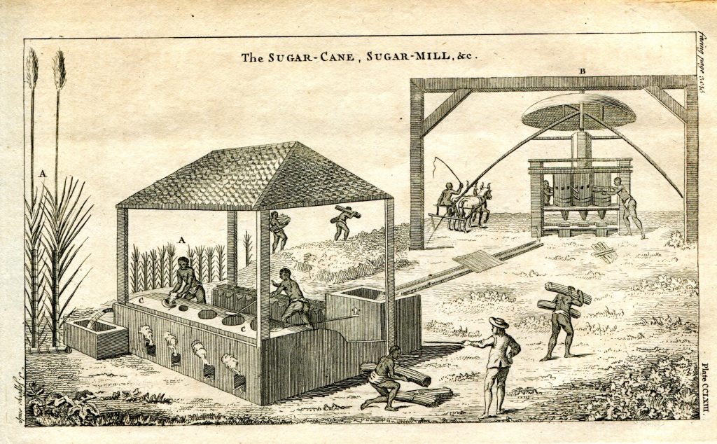 Sugar is produced from juice extracted from the sugar cane. In sugar mills sugar cane was crushed between rollers. These could be powered by hand, animal power, wind or water. In the 18th-19th centuries much of the sugar consumed in Western Europe was produced by slaves on the plantations in the Caribbean.