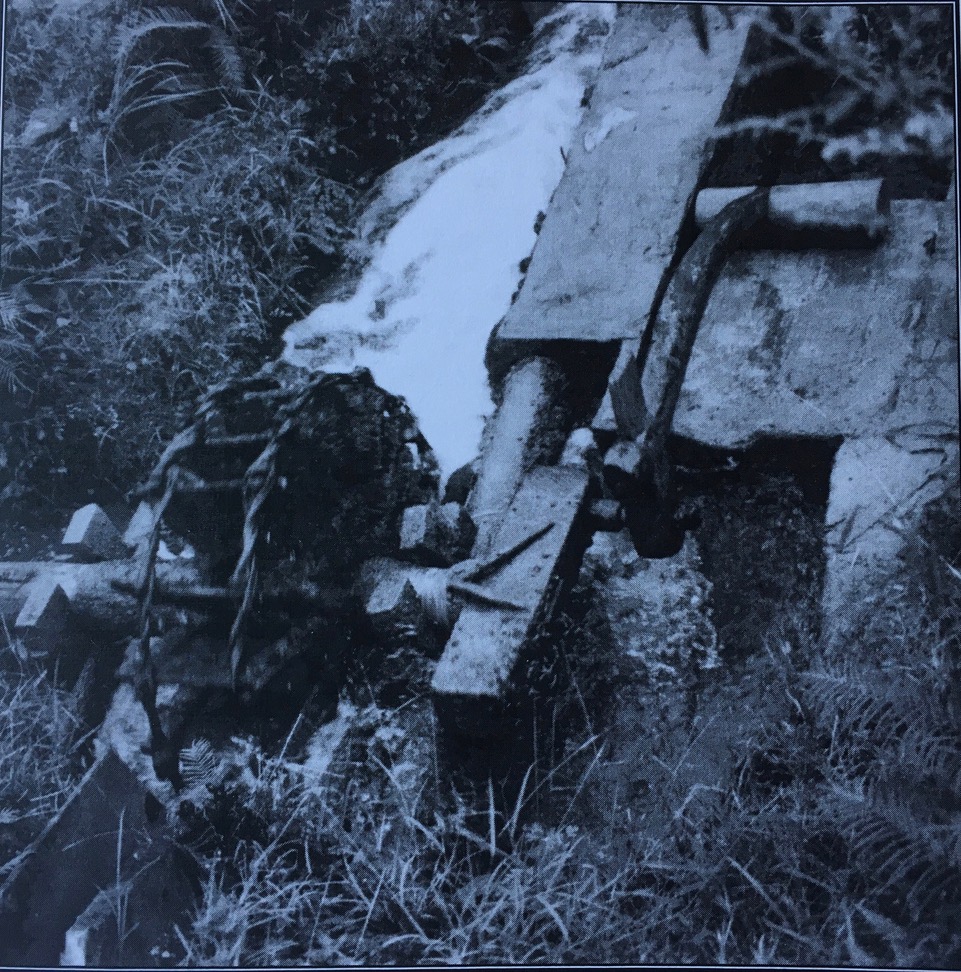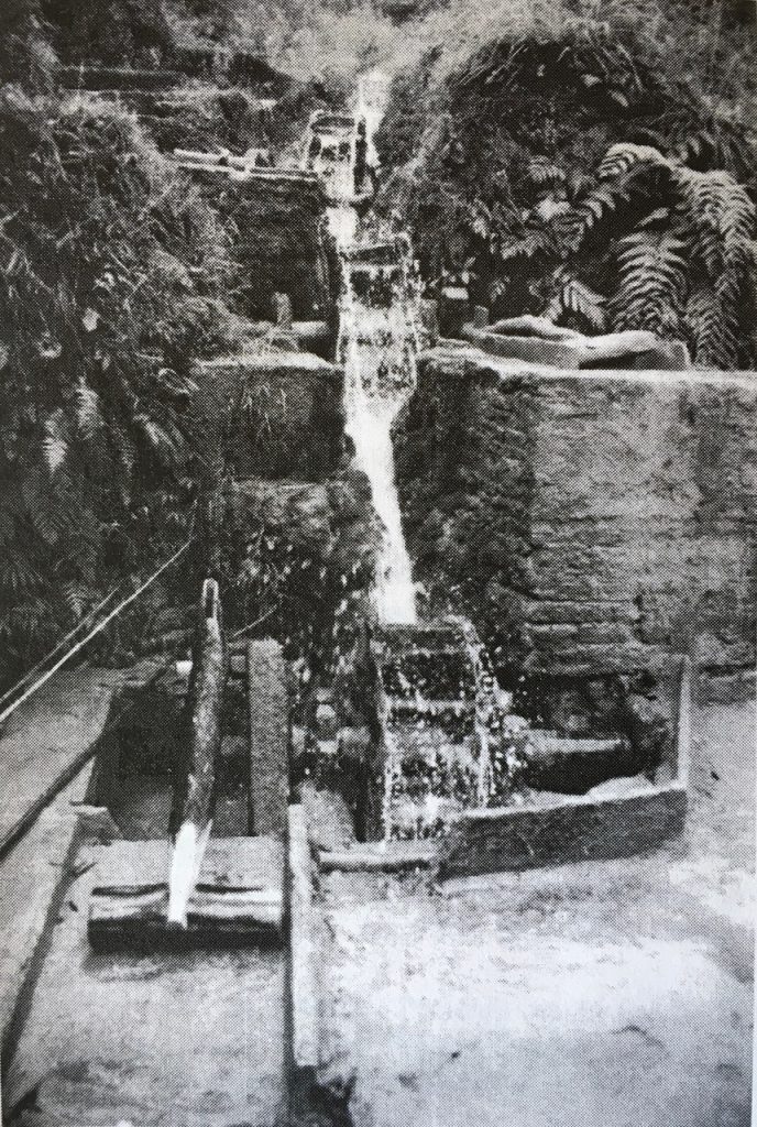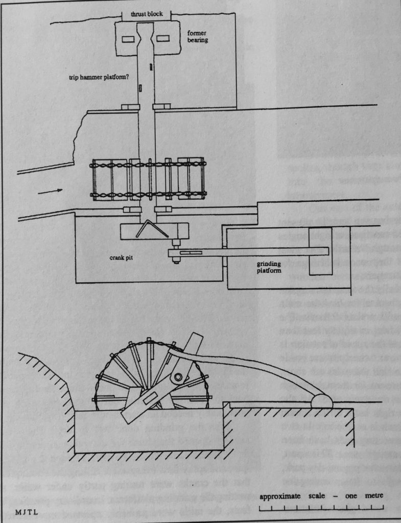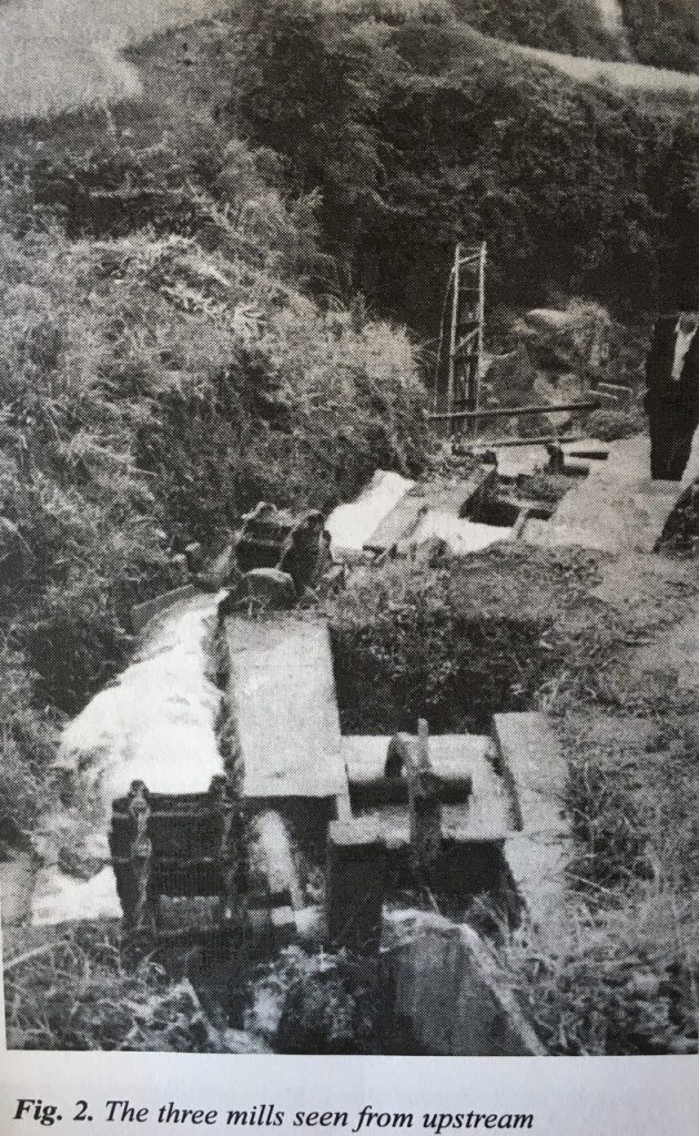 It shows a series of very small waterwheels with crank pits and grinding platforms. The topmost mill has a waterwheel just over a metre in diameter and crudely made of sixteen pairs of radial wooden spokes carrying paddle boards and linked circumferentially by twisted thongs of bamboo. The wheels were undershot. One end of the wheel shaft carried an overhung crank arm in the form of a massive square timber held in place by an oblong tenon with iron clamps.