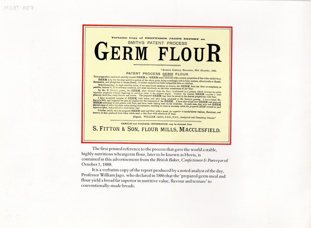 In 1889, at the age of 17, John Figgis Morton joined S Fitton & Sons Flour Millers, as a £1 a week clerk. His job in the ‘Germ Office’ was to sell, advertise and promote ‘Smith’s Patent Germ flour’. Fitton’s was in partnership with Richard Smith, a Staffordshire miller, who had created a unique process of removing the wheat germ, cooking it slightly, adding a bit of salt, and putting it back into the flour. This made a nutritionally very healthy brown loaf, rich in vitamins and longer lasting. However, the name ‘Germ Flour’ wasn’t popular with bakers or their customers because ‘germs’ are associated with disease.