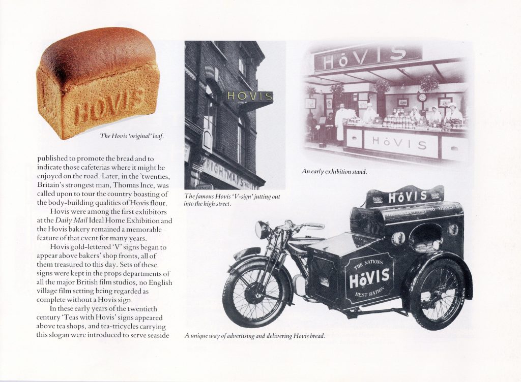 One of the most popular campaigns was Tea with Hovis. The company produced road atlases marking the location of Hovis bakeries and cafes. These could be identified from a distance by distinctive triangular wall signs that jutted out into the street. The atlases also included driving advice, signalling, and ideas for picnic sandwich fillings.
