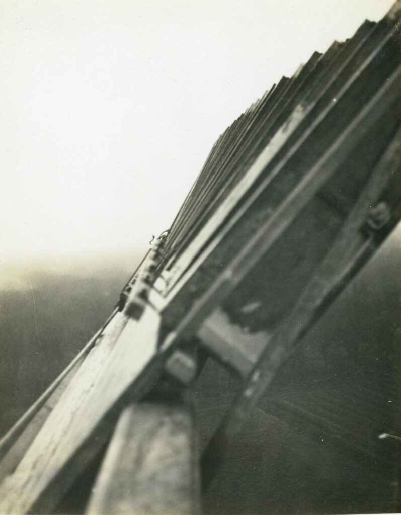 I arrive to find that Tom and Jack Hunt have been given sole charge of the undertaking. Tom, who has been disconnecting and removing the long iron ‘striking’ rod that tunnels the wind-shaft and automatically operates the sail shutters, is now aloft enjoying a few minutes rest. His position seems decidedly precarious.