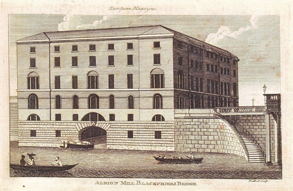 | Probably the world’s first flour factory, however, was Albion Mill built by the Thames at Blackfriars Bridge in London in 1780. The machinery, designed by John Rennie, comprised two steam engines driving 20 pairs of millstones through cast-iron gearing. Although a comparatively short-lived venture ‒ it was burnt to the ground in 1791 ‒ Albion Mill marked the start of the shift in the structure and location of the milling industry towards large mills at ports and urban centres on navigable waterways, and in doing so signalled the beginning of the demise of the small country corn mill. |
