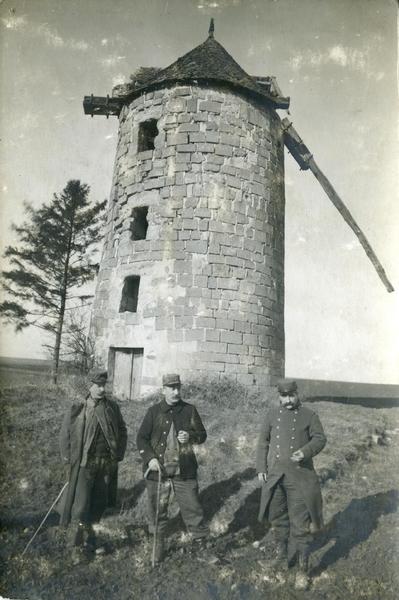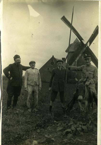 | Other favourite images of Guy’s include these incredibly poignant postcards from the French battlefields of World War I; on the left are Russian and French soldiers posing beside a miller and his son in 1915, and on the right French soldiers beside Moulin de Fontaine les Nonnes, Douy-la-Ramée, Seine-et-Marne. | |