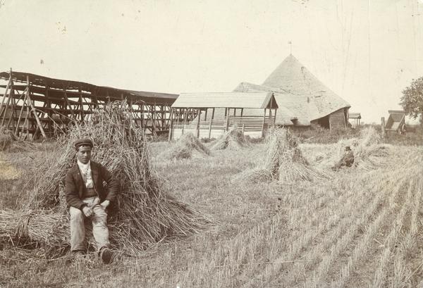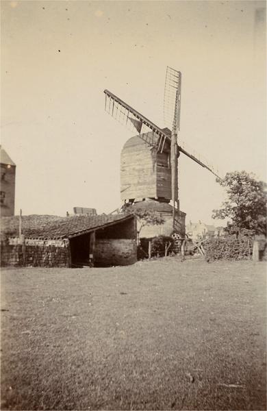| Ron remarks, “I had assumed that the man shown was looking sad because his mill had fallen over. In fact, he was the one who pulled it down.” As the catalogue entry states: “All that remains of the last wind mill in Newark, Notts. Formerly Mr Smith (aged 88) who is in this view remembered 8 mills in this vicinity. He bought this mill which adjoined his timber yard and had it pulled over by means of wire rope and engine last autumn. Notice remains of round house on right. French stones for flour on left.” | |