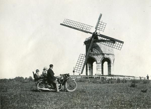| Database Executive, Nataliya, chose this photograph of Chesterton windmill in Warwickshire, showing the distinctive tower mill with one broken sail. Sitting in front of the mill on the motorbike are a Father, Mother and Son, possibly Henry Charles Cross and his family. | |