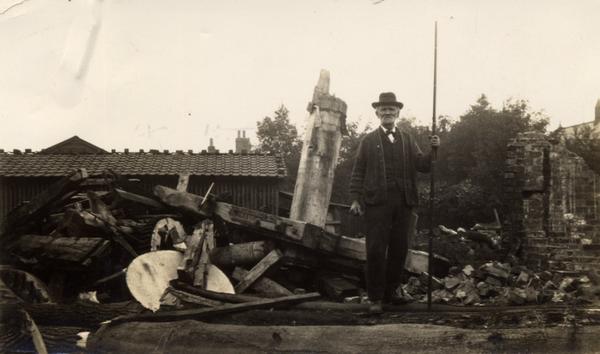 | Our Chairman, Ron Cookson, made an unusual choice. His photograph was taken in July 1928 of the demolished remains of Beacon Hill postmill, Newark, Nottinghamshire. His attention was drawn to it in the early days of the archive and he used it in 2006 to show the damage that could be caused to photographs by paper clips and writing on the back in ink. | |