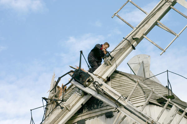 | After 25 years working in local government in Essex, Vincent returned to professional freelance, mainly focusing his work within the Norfolk Broads. Without Vincent’s influence it is likely that the council owned windmills in Essex, as well as others in the county, would be dilapidated and past the point of repair. Therefore his work cannot be appreciated enough in repairing these features of Essex, and more widely, English heritage. During a storm in 2007, the stock of the forward sail of Upminster Windmill snapped. Here Vincent Pargeter is making safe the damage and removing parts of the striking gear. |