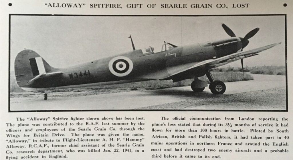 | The “Alloway” Spitfire fighter shown above has been lost. The plane was contributed to the RAF last summer by the officers and employees of the Searle Grain Co. through the Wings for Britain Drive. The plane was given the name, “Alloway”, in tribute to Flight-Lieutenant A.H.F. “Hammy” Alloway, R.C.A.F., former chief assistant of the Searle Grain Co. research department, who was killed on 22 January 1941, in a flying accident in England. The official communication from London reporting the plane’s loss stated that during its 3 ½ months of service it had flown for more than 100 hours in battle. Piloted by South African, British and Polish fighters, it had taken part in 40 major operations in northern France and around the English coast and had destroyed two enemy aircraft and a probably third before it came to its end. | |